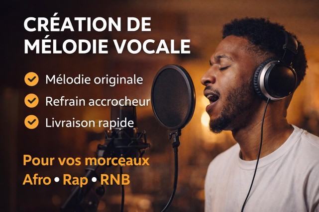 Je suis créateur de mélodies vocales et refrains chantés, spécialisé en Afro, Rap et RNB. j'aide les artistes et beatmakers à trouver des hooks accrocheurs et adaptés à leurs isntru. ✅ Melodies originales ✅ Voix enregistrée propre ✅ Livraison rapide Envoyez -moi votre instru et votre vibe, je m'occupe du reste.