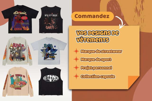 Je conçois des designs de vêtements impactants, modernes et adaptés à votre univers, que ce soit pour :