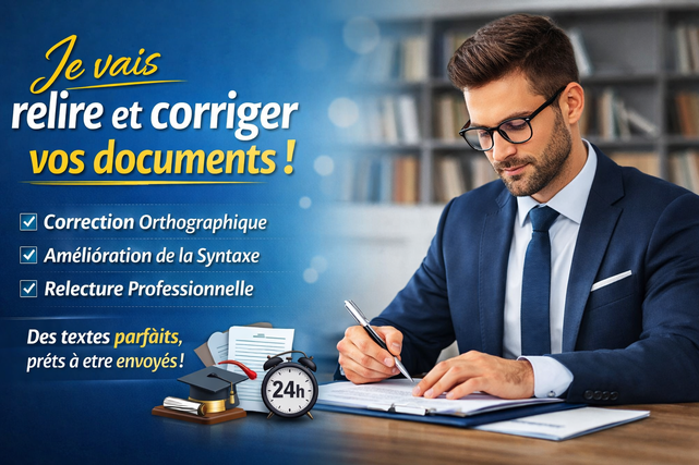 Je vends un service de correction et de relecture professionnelle. Mon objectif est d’éliminer les fautes d’orthographe, erreurs de syntaxe et incohérences dans vos documents, tout en améliorant la lisibilité et la présentation générale.