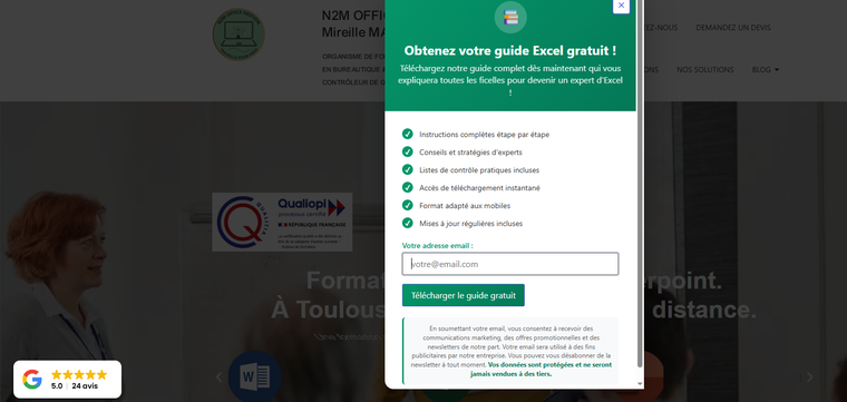 - Un organisme de formation bureautique — De zéro visibilité à page 1 sur "formation excel cpf". Une dizaine de prospects qualifiés captés chaque mois sans dépense publicitaire.