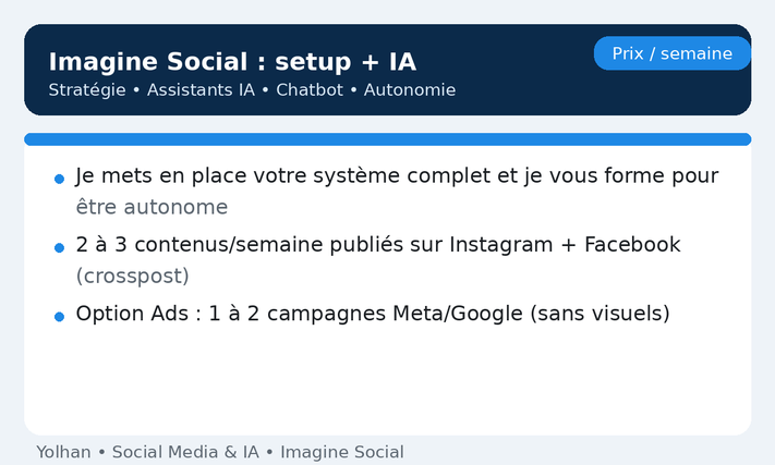Vous êtes indépendant, restaurant, camping ou commerce local et vous voulez publier efficacement sur Instagram/Facebook sans y passer vos soirées ? Je mets en place votre système Imagine Social : une stratégie simple (piliers, angles, CTA) des assistants IA personnalisés (idées, hooks, légendes, CTA, routine) un chatbot (FAQ + qualification + redirection vers réservation/contact) une phase de publication/transition un accompagnement pour que vous puissiez ensuite tout gérer vous-même. 🎯 Objectif : plus de demandes, réservations, messages utiles — et surtout autonomie. ⚠️ Important : l’abonnement Imagine Social est à votre charge (je vous guide pour choisir). Visuels fournis par le client (photos/vidéos smartphone OK).