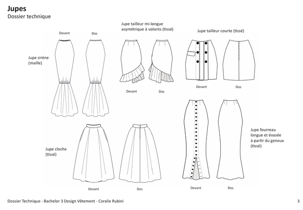 Dessins Techniques à plat (Devant / Dos) pour chaque modèle.