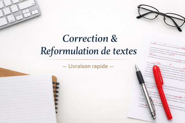 Bonjour et bienvenue sur mon profil ! Je propose des services de correction et reformulation de textes pour particuliers et professionnels. Grâce à mon travail, vos textes deviennent clairs, fluides et professionnels, que ce soit pour : • Emails ou messages professionnels • Devoirs, rapports ou documents scolaires • Présentations, documents administratifs • Tout texte que vous souhaitez rendre impeccable Pourquoi me choisir ? • Travail rapide et soigné • Texte humain, naturel et facile à lire • Livraison respectant vos délais • Réponse rapide à vos questions et satisfaction garantie Je mets tout en œuvre pour que vos textes fassent bonne impression dès la première lecture. N’hésitez pas à me contacter si vous avez des questions, je réponds rapidement !
