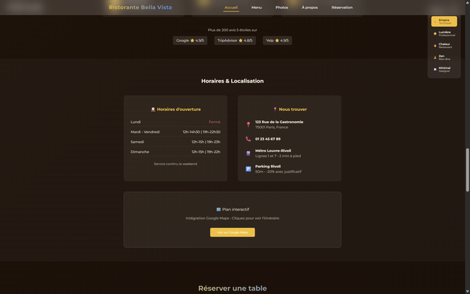– Pages : Accueil, Carte/Menu, Galerie photos, Contact, Réservations