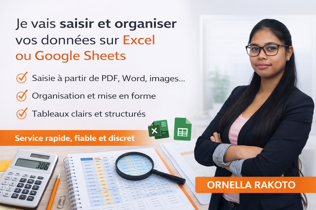 Je peux m’occuper de la saisie de données à partir de documents, de l’organisation et la mise en forme de tableaux, du classement et de nettoyage de données, de la structuration claire de vos fichiers Excel.