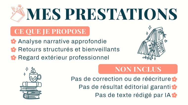À travers ma lecture, j'analyse, je questionne et j'explique toutes mes remarques et mes suggestions. Mes retours ne seront pas toujours confortables. Mais ils seront toujours sincères et constructifs.