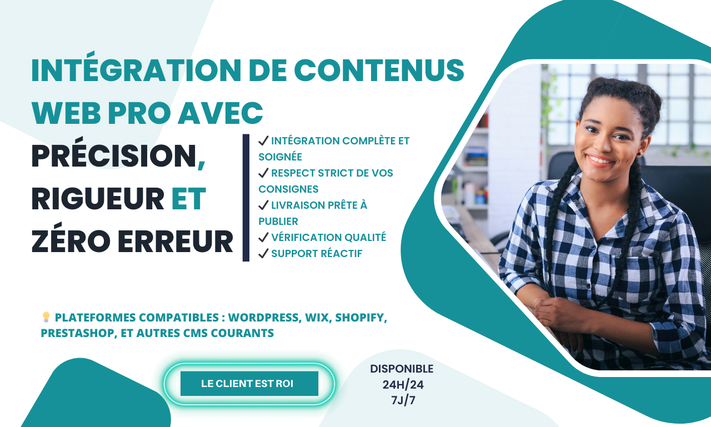 Que vous gériez un site vitrine, une boutique e-commerce, un blog ou une plateforme de formation, je prends en charge l'intégration complète de vos contenus pour que vous puissiez vous concentrer sur votre cœur de métier.