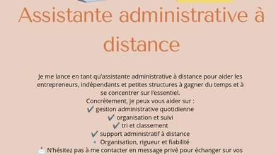 Assistante administrative à distance, j’accompagne les indépendants, coachs et thérapeutes dans la gestion de leur administratif. Organisation, gestion des emails, mise en page de documents et soutien administratif : je vous aide à gagner du temps et à vous concentrer sur votre activité. Sérieuse, organisée et adaptable, je propose un accompagnement souple selon vos besoins. Disponible rapidement – travail à distance.