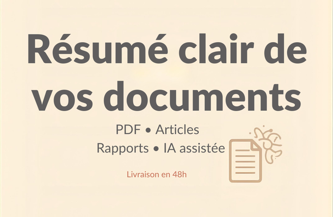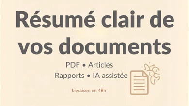 Je résume des documents longs ou complexes en textes clairs et structurés. Je transforme des PDF, rapports ou articles en synthèses faciles à lire, en mettant en avant les points essentiels. J’utilise des outils d’IA pour travailler efficacement tout en garantissant clarté et structure. Ce service est idéal si vous manquez de temps et souhaitez aller à l’essentiel, sans perdre d’informations importantes.