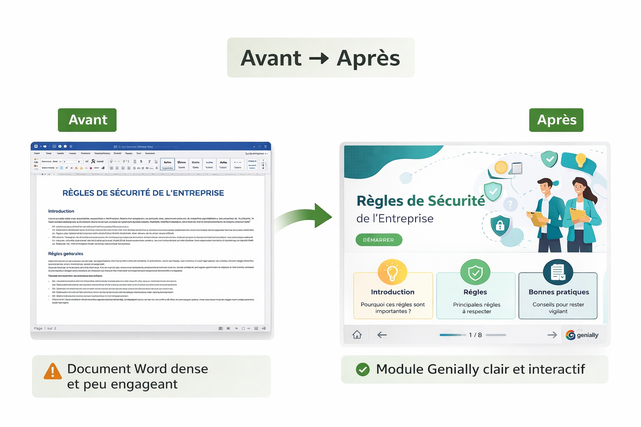 Le processus est simple et fluide. Vous m’envoyez votre PowerPoint et vos objectifs, nous validons ensemble vos besoins, puis je réalise votre Genially clé en main, prêt à être partagé ou présenté.