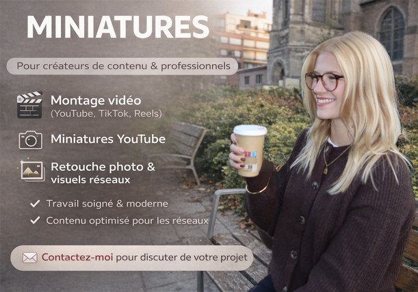 Que ce soit pour YouTube, TikTok ou un projet perso, je t’aide à transformer tes miniatures en un vrai atout pour tes vidéos, le tout sans stress ni prise de tête
