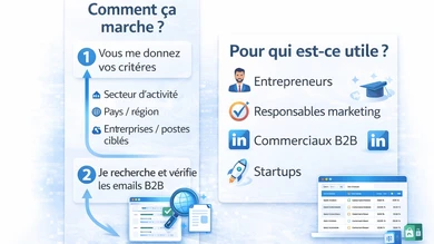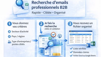 Je vous aide à trouver des informations fiables et des contacts professionnels pour vos projets. Mes prestations sont les suivantes : ✔ Recherche d'informations sur internet ✔ Recherche d'emails professionnels B2B pour la prospection ✔ Création de listes de prospects qualifiés ✔ Recherche d'entreprises par secteur ou par pays ✔ Organisation de données dans Excel ou Google Sheets ✔ Rédaction de messages de prospection B2B (Email & LinkedIn) optimisés pour obtenir des réponses Je vous aide non seulement à trouver vos prospects, mais aussi à les contacter de façon efficace avec des messages qui convertissent. Je m’appuie sur des sources fiables pour vous transmettre des informations claires et structurées. ✔ Travail sérieux ✔ Communication rapide ✔ Respect des délais ✔ Données contrôlées N'hésitez pas à me contacter pour échanger sur votre projet.