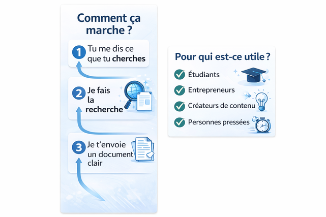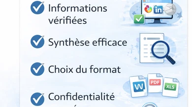 Je sélectionne des sources fiables, vérifiées et pertinentes, puis je vous livre une synthèse structurée et professionnelle.