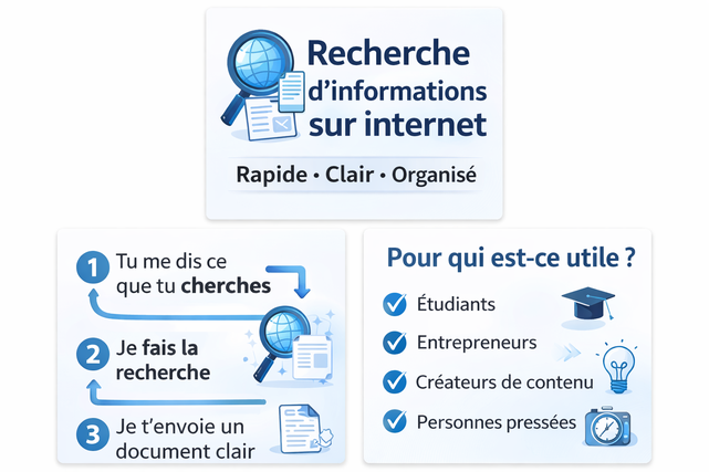 Je réalise pour vous une recherche approfondie sur un sujet précis afin de vous fournir des informations claires, organisées et directement exploitables.