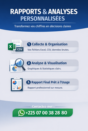 Je suis analyste de données spécialisé en Excel avancé et Python, avec une approche orientée résultats concrets et solutions pratiques pour les entreprises, entrepreneurs et porteurs de projets. Mon objectif est simple : transformer vos données brutes en informations claires, fiables et exploitables, afin de vous aider à prendre de meilleures décisions, gagner du temps et améliorer vos performances. 💡 Ce que je fais pour vous Je vous accompagne à chaque étape de votre projet : Nettoyage et structuration des données (fichiers Excel, CSV, bases de données) Analyses statistiques et financières Création de tableaux de bord dynamiques et automatisés Automatisation de tâches répétitives avec Excel et Python Rapports clairs et compréhensibles, même pour les non-techniciens Optimisation des processus de suivi, de gestion et de reporting 🛠️ Outils et compétences Excel avancé : formules complexes, tableaux croisés dynamiques, Power Query, automatisation Python : Pandas, NumPy, Matplotlib, automatisation et analyse avancée Visualisation de données claire et professionnelle Structuration et exploitation de données pour la prise de décision 🎯 À qui s’adresse mon service ? Entrepreneurs et PME Étudiants et chercheurs Entreprises de services, commerces, projets techniques Toute personne ayant des données mais ne sachant pas comment les exploiter 🤝 Pourquoi me choisir ? ✔️ Approche pédagogique et orientée client ✔️ Solutions personnalisées, adaptées à vos besoins réels ✔️ Respect des délais et communication claire ✔️ Confidentialité et sérieux professionnel ✔️ Résultats exploitables, pas de jargon inutile Je ne me contente pas de faire des calculs : je vous explique les résultats, je vous montre quoi faire avec, et je vous aide à passer à l’action. 📩 Besoin d’un tableau de bord, d’une analyse ou d’une automatisation ? Contactez-moi et transformons ensemble vos données en un véritable outil de décision.