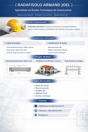 Grâce à mon expertise en résistance des matériaux (RDM), béton armé, analyse structurelle, et modélisation sur logiciels CAO (SketchUp, etc.), je transforme vos idées en dossiers techniques exploitables et sécurisés.
