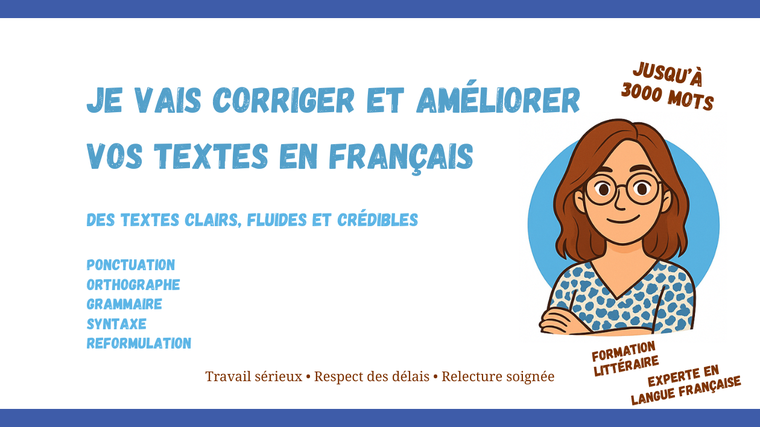 Mon expérience professionnelle m’a permis de développer une grande rigueur dans la maîtrise du français écrit. Aujourd’hui, je mets ces compétences au service de vos textes pour vous aider à obtenir un rendu clair, fluide et professionnel.