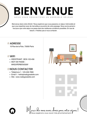 Je vous propose de créer un livret d'accueil complet et élégant, personnalisé avec vos informations. Pour 17,59 $US, vous recevrez un document PDF de 5 pages comprenant : une page de bienvenue, vos codes wifi et contacts, le règlement intérieur, le mode d'emploi des équipements et vos bonnes adresses locales.