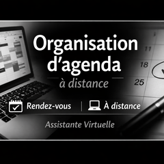 Bonjour, Je propose un service d'organisation d'agenda à distance pour les entrepreneurs, coachs, indépendants ou petites entreprises. ~~Mes missions: ~~ Gestion de vos rendez-vous dans GOOGLE AGENDA Réponse aux demandes de vos clients Envoi de rappels pour éviter les oublis Organisation quotidienne de votre planning Sérieuse, organisée et disponible, je m'adapte à vos besoins pour que votre agenda soit toujours clair et efficace. N'hésitez pas à me contacter pour en discuter et commencer à vous libérer du stress de la gestion de planning !