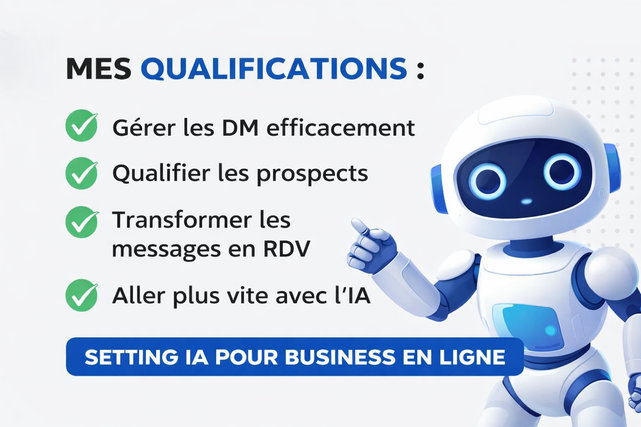 Setter IA spécialisé dans la qualification de prospects et la prise de rendez-vous pour entrepreneurs, coachs et business en ligne. Grâce à l’intelligence artificielle, j’aide mes clients à répondre plus vite, mieux qualifier leurs leads et augmenter leur taux de conversion sans perdre de temps. Je mets en place des scripts de messages optimisés, des réponses assistées par IA et une organisation efficace pour transformer les conversations en ventes. Disponible, réactif et orienté résultats. Contactez-moi avant commande pour discuter de votre besoin.