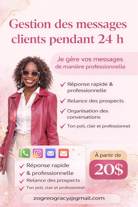 Assistante virtuelle francophone sérieuse, organisée et dynamique, spécialisée en communication, rédaction et relation client. J’accompagne les entrepreneurs, boutiques en ligne et PME dans la gestion quotidienne de leurs tâches afin de leur faire gagner du temps, améliorer leur image professionnelle et augmenter leurs ventes. 🔹 Mes services : • Gestion des messages clients (WhatsApp, Instagram, Facebook, Messenger) • Rédaction de messages professionnels, posts et emails • Organisation, suivi et relance clients • Assistance administrative à distance • Support commercial & aide à la vente 🔹 Mes qualités : Sérieuse • Organisée • Réactive • Autonome • Discrète • Professionnelle 🎯 Objectif : Vous permettre de vous concentrer sur votre activité pendant que je m’occupe de votre communication et de votre relation client, pour des résultats concrets et durables.