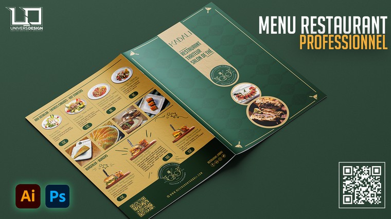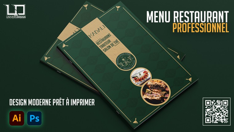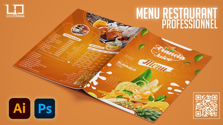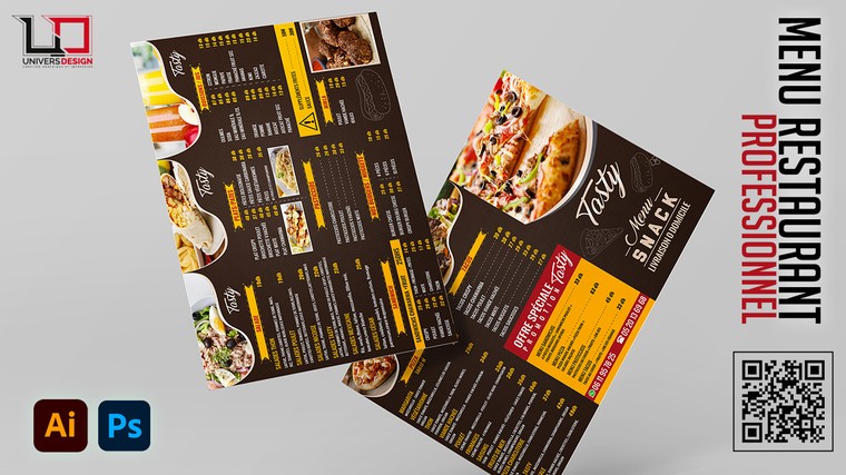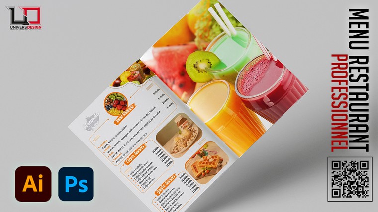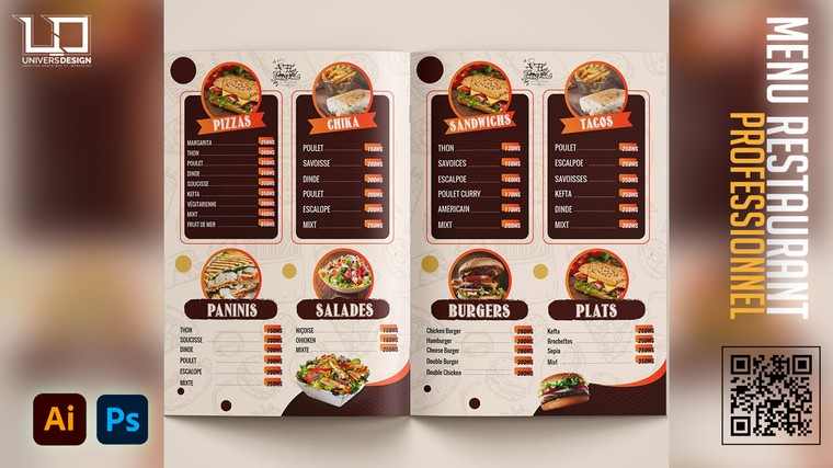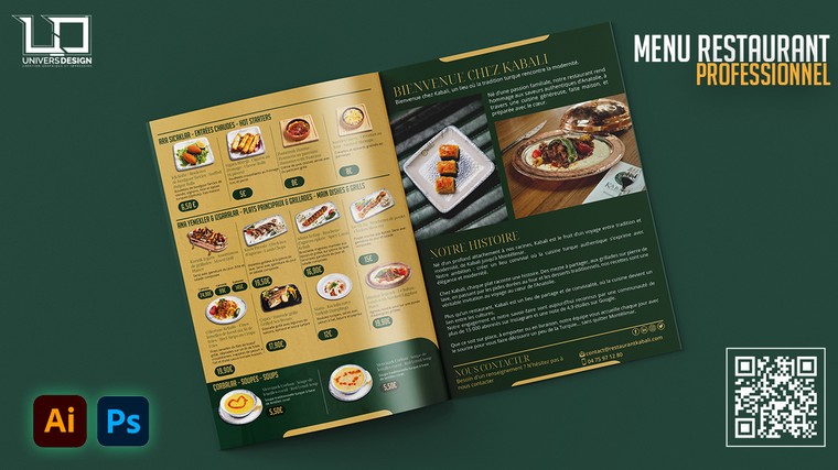 Je vous propose la création d’un menu sur mesure, moderne, clair et structuré, conçu pour mettre en valeur vos plats et renforcer l’image de votre établissement.
