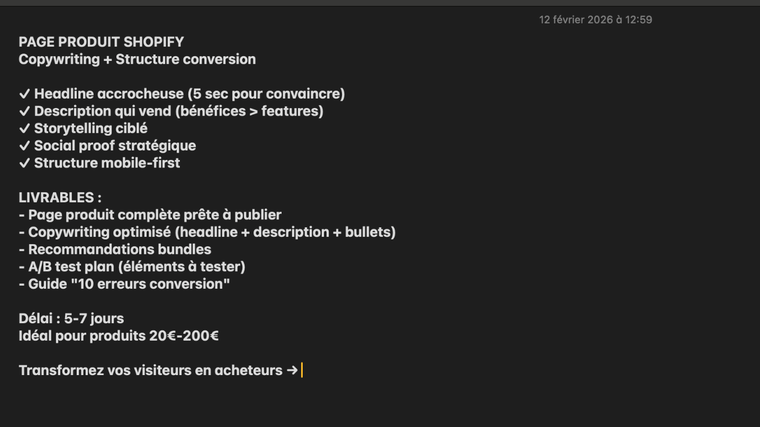 Je crée ou réécris votre page produit Shopify pour maximiser les ventes. Pas de template générique : du sur-mesure basé sur votre produit et votre marché.