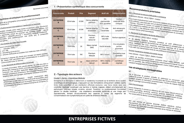 **→ Cartographie concurrentielle complète** — Positionnement de 5 concurrents sur des axes stratégiques (prix/valeur,