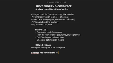 👋 Salut, moi c'est François. J'aide les e-commerçants à optimiser leurs conversions et lancer des campagnes Meta Ads rentables. 🎯 CE QUE JE FAIS CONCRÈTEMENT : ✅ Audit Shopify complet + Plan d'action conversion ✅ Pages produits qui vendent (copywriting + structure) ✅ Setup et optimisation Meta Ads (Facebook/Instagram) Pas de blabla théorique. Que des recommandations actionnables basées sur l'expérience terrain. 📊 MON APPROCHE : Data-driven : je base mes décisions sur les chiffres, pas sur des "je pense que" Focus ROAS et rentabilité : chaque euro dépensé doit générer du retour Spécialiste DTC : je connais les problématiques des marques en direct-to-consumer 💼 MON EXPÉRIENCE : J'ai lancé et géré plusieurs marques DTC sur Shopify (marché UK et FR). J'ai run mes propres campagnes Meta Ads, optimisé mes propres pages produits, testé des dizaines de stratégies de bundling. Résultat ? Je sais ce qui marche et ce qui ne marche pas. Pas par la théorie, mais par la pratique. 🔥 IDÉAL POUR : Boutiques e-commerce qui font 500€-10K€/mois et veulent scaler Marques avec un taux de conversion <2% Entrepreneurs qui dépensent en ads sans résultats satisfaisants E-commerçants qui veulent des recommandations concrètes, pas des powerpoints de consulting ⚡ POURQUOI TRAVAILLER AVEC MOI ? Je ne suis pas un consultant qui n'a jamais lancé de business. J'ai vécu les mêmes galères que vous : budget ads qui part en fumée, taux de conversion pourri, pages produits qui ne convertissent pas. La différence ? J'ai trouvé ce qui marche et je peux vous éviter de perdre du temps et de l'argent. Approche directe, sans langue de bois. Si je pense que votre produit ou votre marge ne permet pas de faire du Meta Ads rentable, je vous le dis avant que vous commandiez. 📬 BESOIN D'INFOS ? Contactez-moi avant de commander, on discute de votre projet. Je réponds sous 2h en journée. Let's grow your business 🚀