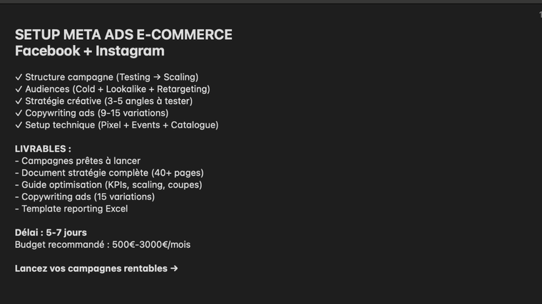 Approche honnête : si votre produit ou votre marge ne permet pas de faire du Meta Ads rentable, je vous le dirai avant que vous commandiez.