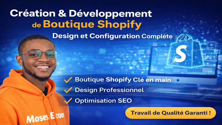Proposé par mosesonwen •Développeur Shopify, conception de boutique, personnalisation de thème dropshipping, CRO Expert Vente au total 0