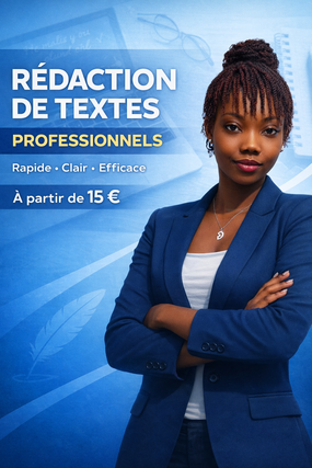 Rédactrice francophone spécialisée dans la rédaction de textes promotionnels clairs, simples et efficaces. J’aide les entrepreneurs, petites entreprises et créateurs de contenu à mieux présenter leurs produits et services afin d’attirer plus de clients. Mes textes sont structurés, sans fautes, et adaptés à votre objectif (informatif, descriptif ou promotionnel). Sérieuse, réactive et à l’écoute, je m’engage à livrer un travail professionnel dans les délais convenus.