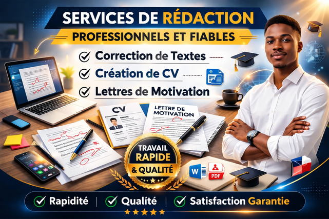 Je suis sérieux, motivé et ponctuel. Je propose des services de correction de texte, rédaction de lettres de motivation et création de CV simples. Travail soigné, livraison rapide et satisfaction garantie.