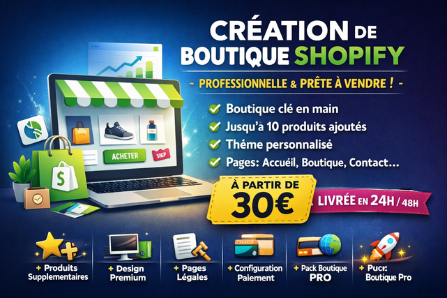 Vous voulez une boutique Shopify propre, moderne et prête à vendre, sans passer des heures à chercher comment tout régler ?