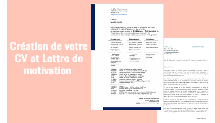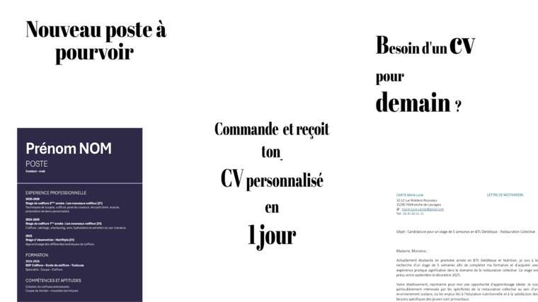 Mise en page d'un cv et lettre de motivation avec les informations que vous m'aurez donné pour un poste ciblé.