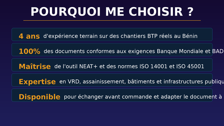 Professionnelle HSE avec près de 4 ans d'expérience terrain sur des chantiers BTP (VRD, assainissement, bâtiments) au Bénin, je suis spécialisée dans la rédaction des documents environnementaux et sociaux exigés dans les appels d'offre. J'ai rédigé de manière autonome des dossiers ESHS pour des projets majeurs financés par des bailleurs internationaux, notamment la construction d'arènes culturelles, d'infrastructures publiques et de voiries urbaines à Cotonou. Mes documents sont conformes aux exigences des bailleurs internationaux (Banque Mondiale, BAD, AFD) et aux normes ISO 14001 et ISO 45001. Je travaille avec les entreprises BTP, les bureaux d'études et les ONG qui ont besoin de documents ESHS solides pour remporter leurs appels d'offre.