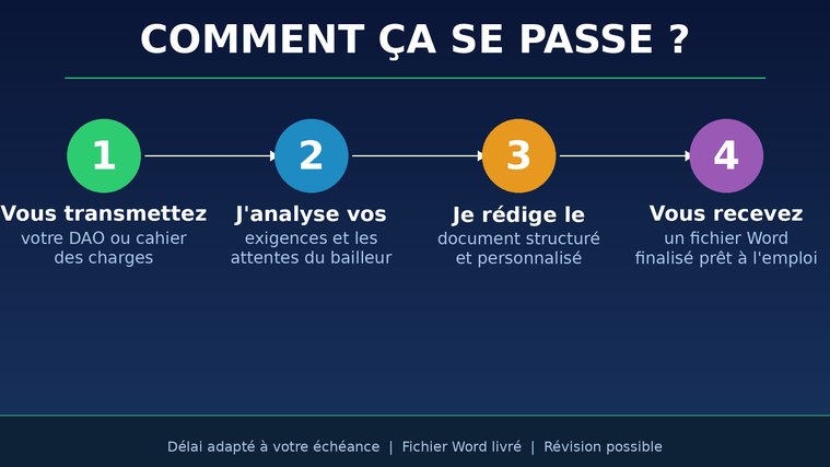 Voici comment je procède : vous me transmettez votre dossier d'appel d'offre ou votre cahier des charges, j'analyse vos exigences spécifiques, je rédige le document adapté à votre projet et je vous livre un fichier Word finalisé prêt à l'emploi.