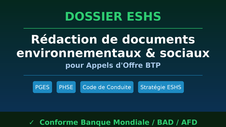 Pour le prix de départ je rédige un document ESHS de votre choix : plan de gestion environnementale et sociale, plan hygiène sécurité environnement, code de conduite ou clauses contractuelles environnementales et sociales. Le document est structuré, professionnel et directement intégrable dans votre dossier d'appel d'offre.