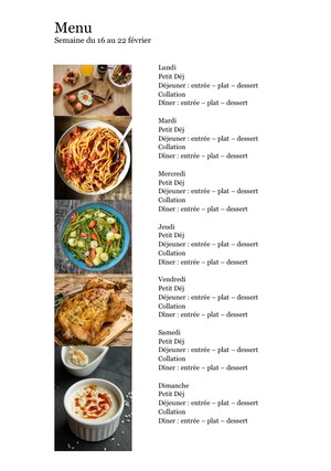 - Une semaine : menu complet (petit-déjeuner - déjeuner - soir)