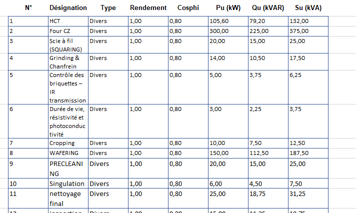 Liste des appareils/charges + puissance (W/kW) et quantité