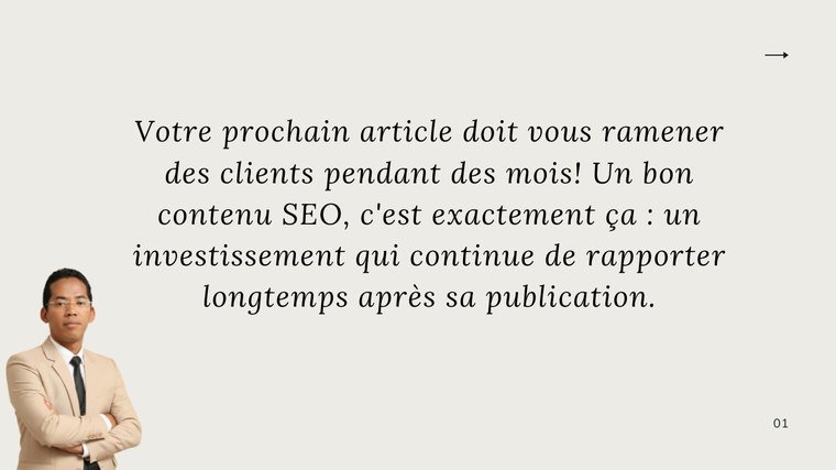 Mon approche est simple. Je pars de vos objectifs et de votre audience, je fais ma recherche de mots-clés, puis je rédige un contenu structuré, fluide et pensé pour convertir. Chaque article est écrit pour être lu par de vraies personnes tout en cochant toutes les cases du référencement naturel : balises optimisées, structure Hn, maillage interne, méta-description travaillée.