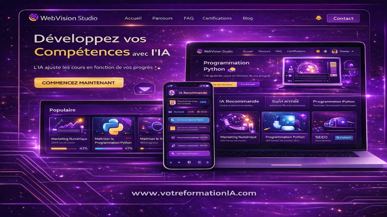 **Alors, WebVision Studio** vous propose de créer une **plateforme de formation en ligne** intelligente et **optimisée par l'IA** pour offrir une expérience **personnalisée** à vos étudiants. Avec notre technologie avancée, votre plateforme ne sera pas seulement un site, mais un **outil interactif** qui ajuste les parcours d'apprentissage selon les progrès de chaque étudiant .