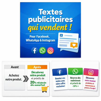 Je crée pour votre entreprise des textes publicitaires courts, clairs et impactants pour vos posts Facebook, WhatsApp et Instagram.