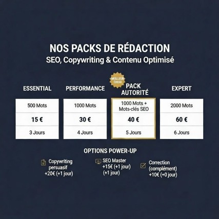 Chaque pack inclut : Rédaction + Balisage HTML + 1 Retouche.