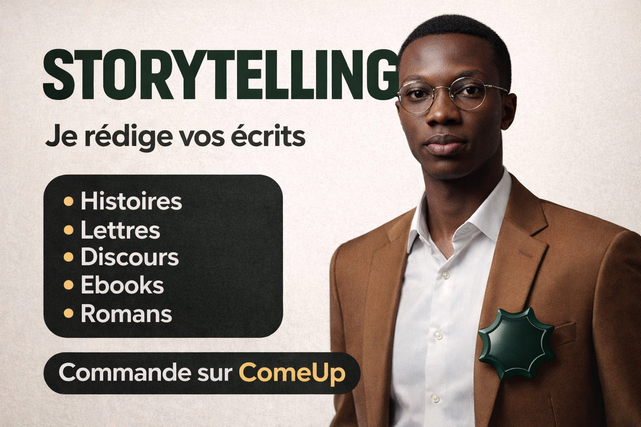 Bonjour, je suis Amani, fondateur de Amani CréaPro. Je transforme vos idées en créations uniques et percutantes. Mes services incluent : Storytelling : histoires, lettres, Ebooks, discours, biographies et témoignages Paroles de chansons : projets personnels ou entreprises, jingles, hymnes, singles Chaque création est originale, adaptée à votre objectif et livrée rapidement. Que vous soyez un particulier ou une entreprise, je m’adapte à vos besoins pour vous offrir un résultat professionnel, impactant et mémorable