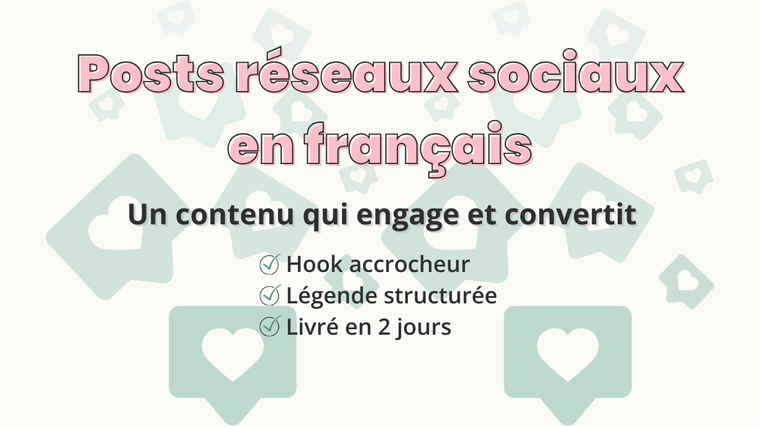 Je suis Mylène, rédactrice web SEO freelance. Je propose uniquement la rédaction — aucun visuel n'est inclus. Pour le prix de base, je rédige 3 légendes de posts (Instagram, Facebook, LinkedIn, Threads) avec hook accrocheur, légende structurée et call-to-action. Livré en document Word ou Google Doc. 1 révision incluse. Je rédige exclusivement en français.