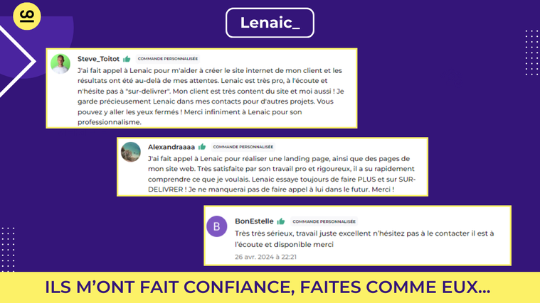 "Un grand merci à Lenaïc pour son travail exceptionnel sur ma landing page ! Professionnel, réactif et toujours disponible, il a su répondre à toutes mes attentes avec une grande expertise. Je recommande vivement ses services à tous ceux qui recherchent un prestataire sérieux et compétent. Encore bravo et merci pour ton excellent travail ! 👏👍"