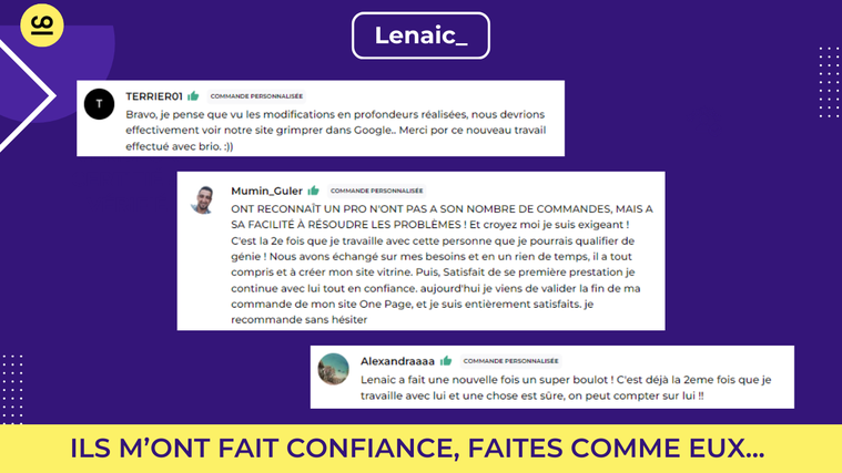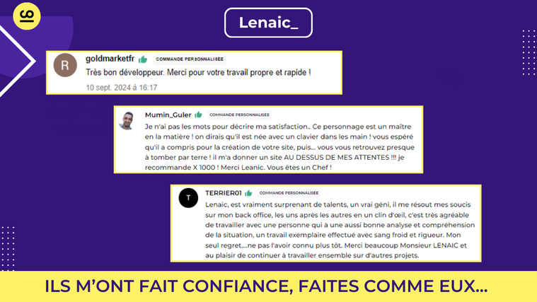 🏆 Vendeur N°1 en Création de Site Web sur ComeUp 🏆 Trophées Systeme.io pour avoir généré +100 000€ de ventes pour deux de mes clients avec Systeme.io ✅ +4 ans d'expérience riche | 📞 Disponible en appel | 💰 Prix accessibles & flexibles | ⭐ +100 clients satisfaits - Top Vendeur ComeUp Vous avez une vision. Un projet qui vous tient à cœur. Peut-être même des nuits passées à y penser. Mais entre l'idée et la réalité en ligne, il y a un monde. Et confier ça à la mauvaise personne, c'est risquer de voir votre projet mal exécuté, livré en retard, ou pire, abandonné en cours de route. C’est justement pour éviter ça que je suis là. Vous êtes au bon endroit. 👋 Hello, moi c'est Lenaïc, Développeur Full Stack & Funnel Builder. Avec +4 ans d'expérience et une licence en Informatique et Télécommunications, j'ai accompagné plus de 100 entrepreneurs, startups et PME dans la construction de leur présence digitale. Autour de moi, une équipe solide constituée d'Amandine, experte SEO, Célian, expert Funnel Building, et Zeyneb, experte en Automatisation IA. Ensemble, nous assurons une expertise 360° du digital pour que chaque aspect de votre projet soit traité avec le plus haut niveau de compétence. Ce que nous faisons concrètement pour vous 💎 Création de sites web - code sur mesure & WordPress, rapides, modernes et optimisés SEO 💎 Tunnels de vente & landing pages - Systeme.io haute conversion, pensés pour transformer vos visiteurs en clients 💎 Boutiques Shopify haut de gamme - design branded, fiches produits optimisées, prêtes à vendre dès le premier jour 💎 Automatisation IA - Make, Zapier, ChatGPT intégré, pour que votre business tourne sans vous 💎 Web scraping - extraction de données sur mesure, propres, structurées et directement exploitables 💎 Marketing digital & SEO - stratégie de conversion, référencement naturel, copywriting orienté résultats Ce que disent les clients qui ont travaillé avec nous 👉 "Lenaïc est un professionnel exceptionnel. Toujours à l'écoute, réactif et précis. Le rendu dépasse mes attentes." ⭐⭐⭐⭐⭐ 👉 "Super travail, rapide, efficace, très professionnel. Il est allé au-delà du travail demandé." ⭐⭐⭐⭐⭐ 👉 "Un grand merci à Lenaïc. Le résultat correspond exactement à notre vision. Je recommande les yeux fermés." ⭐⭐⭐⭐⭐ 👉 "Sérieux, compétent et à l'écoute. Chaque livrable est soigné et professionnel." ⭐⭐⭐⭐⭐ Prêt à construire quelque chose de grand ? Votre projet mérite mieux qu'un prestataire qui disparaît après la livraison. Il mérite quelqu'un qui s'y implique vraiment, du premier message jusqu'au résultat final. ✅ Votre succès est ma priorité. Votre satisfaction, ma signature. Décrivez-moi votre projet et je vous réponds rapidement avec une approche concrète. 🚀 Et ensemble, nous ferons de votre vision une réalité. Lenaïc 🥇