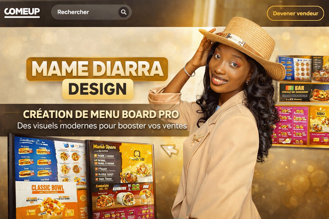 Je suis Mame Diarra, designer spécialisée dans la création de logos et d’affiches professionnels. Je vous aide à donner à votre entreprise une identité visuelle forte, moderne et mémorable qui attire l’œil de vos clients et valorise vos produits ou services.