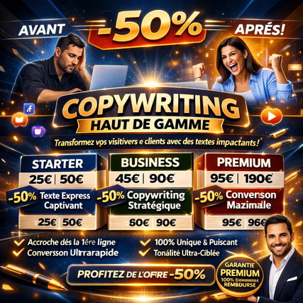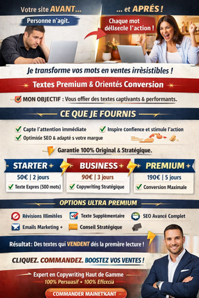 Maintenant, imaginez le même site, avec un texte ultra-stratégique et persuasif. Chaque phrase captive, chaque mot déclenche l’action, chaque visiteur se transforme en client.